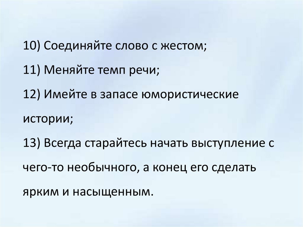 10) Соединяйте слово с жестом;11) Меняйте темп речи;