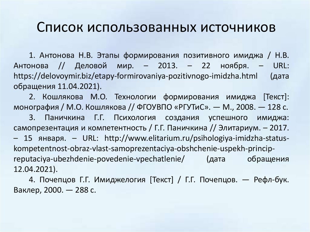 Список использованных источников1. Антонова Н.В. Этапы формирования позитивного имиджа / Н.В.