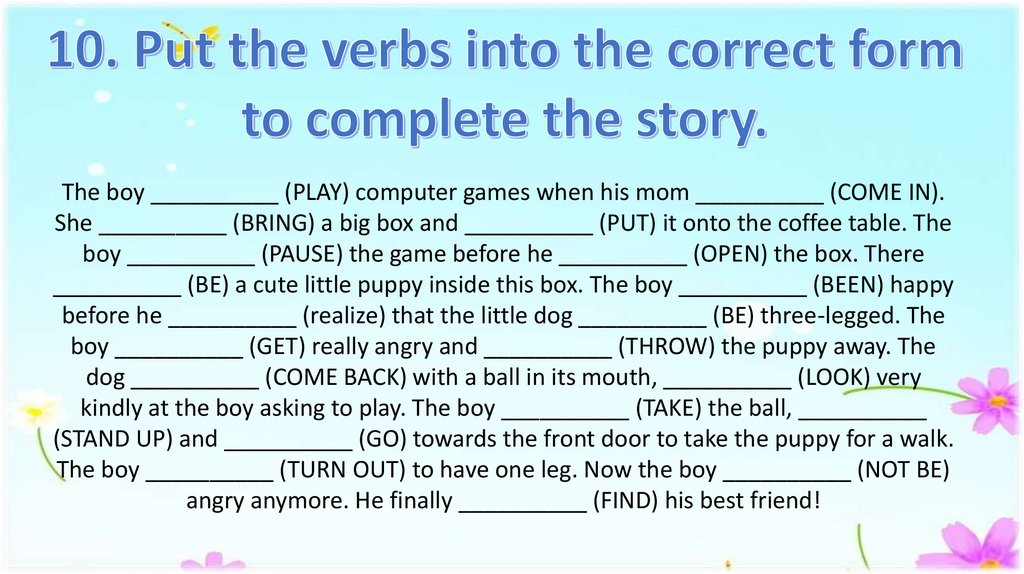 The boy __________ (PLAY) computer games when his mom __________ (COME IN).She __________ (BRING) a big box and __________ (PUT) it onto the coffee table. The