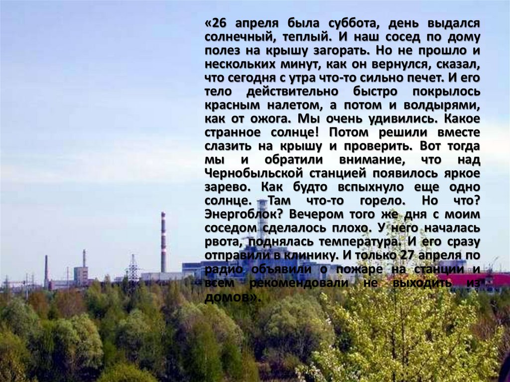 «26 апреля была суббота, день выдалсясолнечный, теплый. И наш сосед по дому