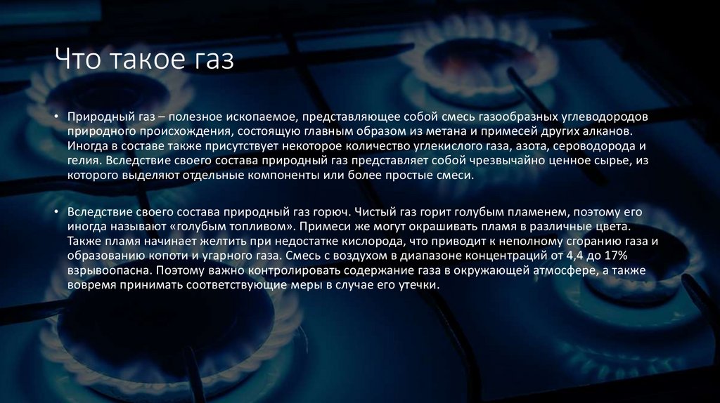 • Вследствие своего состава природный газ горюч. Чистый газ горит голубым пламенем, поэтому его