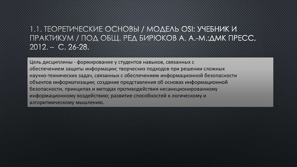 Цель дисциплины - формирование у студентов навыков, связанных собеспечением защиты информации; творческих подходов при решении сложных