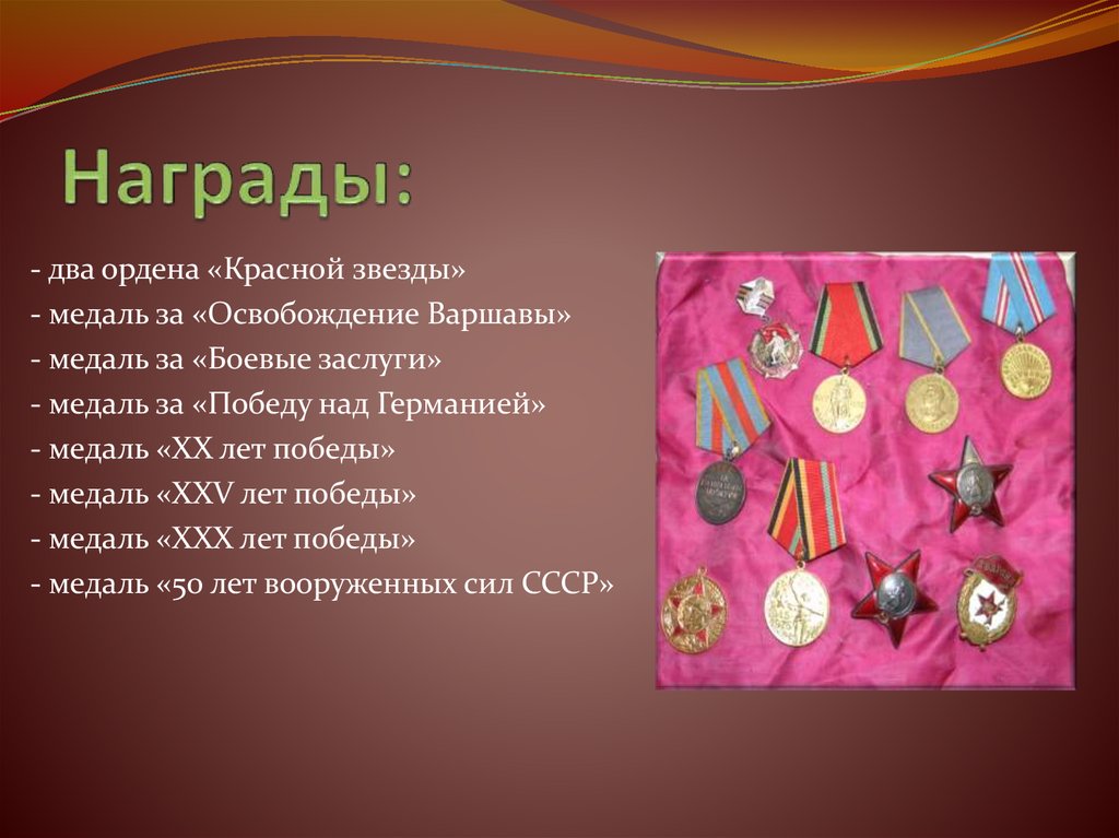 - два ордена «Красной звезды»- медаль за «Освобождение Варшавы»