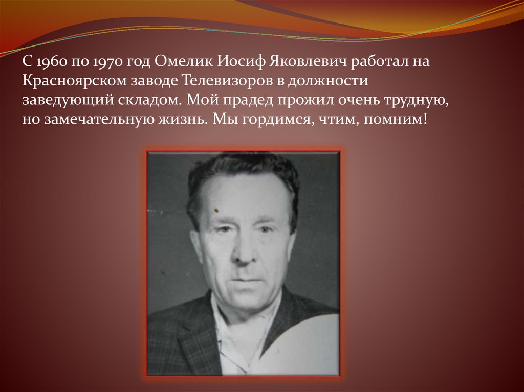 С 1960 по 1970 год Омелик Иосиф Яковлевич работал наКрасноярском заводе Телевизоров в должности