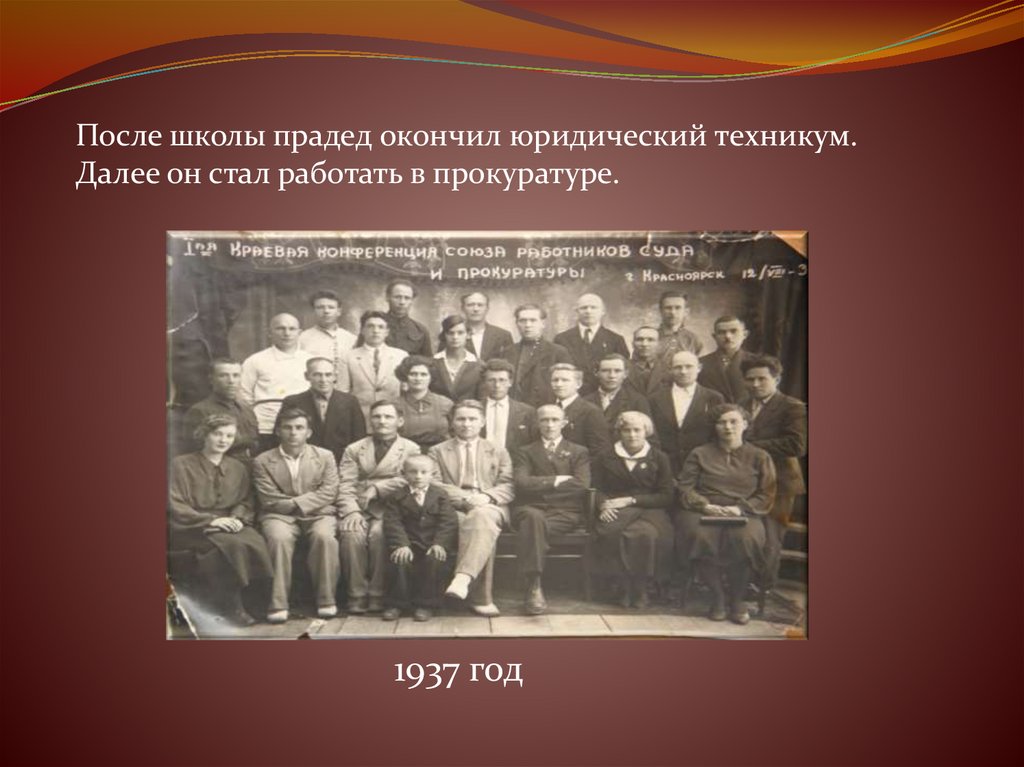 После школы прадед окончил юридический техникум.Далее он стал работать в прокуратуре.