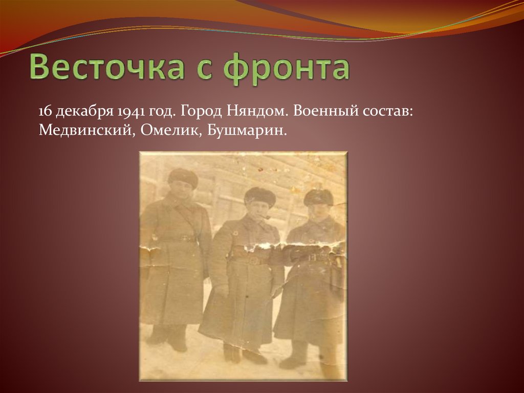 16 декабря 1941 год. Город Няндом. Военный состав:Медвинский, Омелик, Бушмарин.
