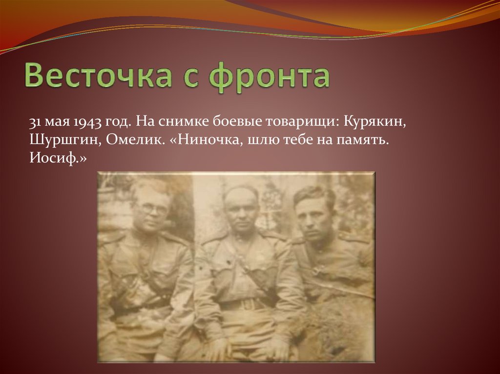 31 мая 1943 год. На снимке боевые товарищи: Курякин,Шуршгин, Омелик. «Ниночка, шлю тебе на память.
