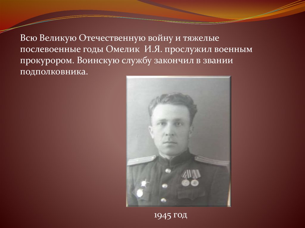 Всю Великую Отечественную войну и тяжелыепослевоенные годы Омелик И.Я. прослужил военным