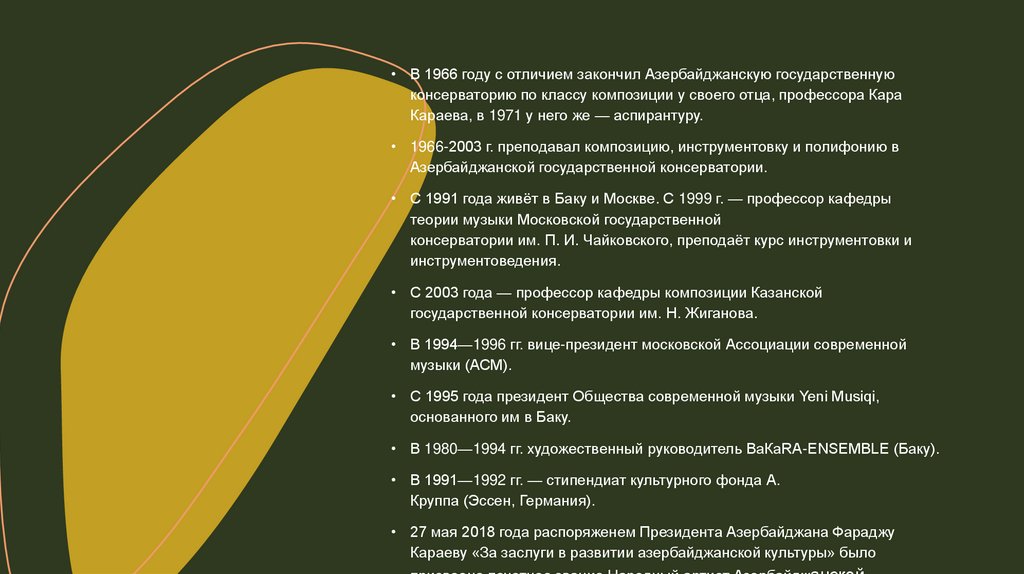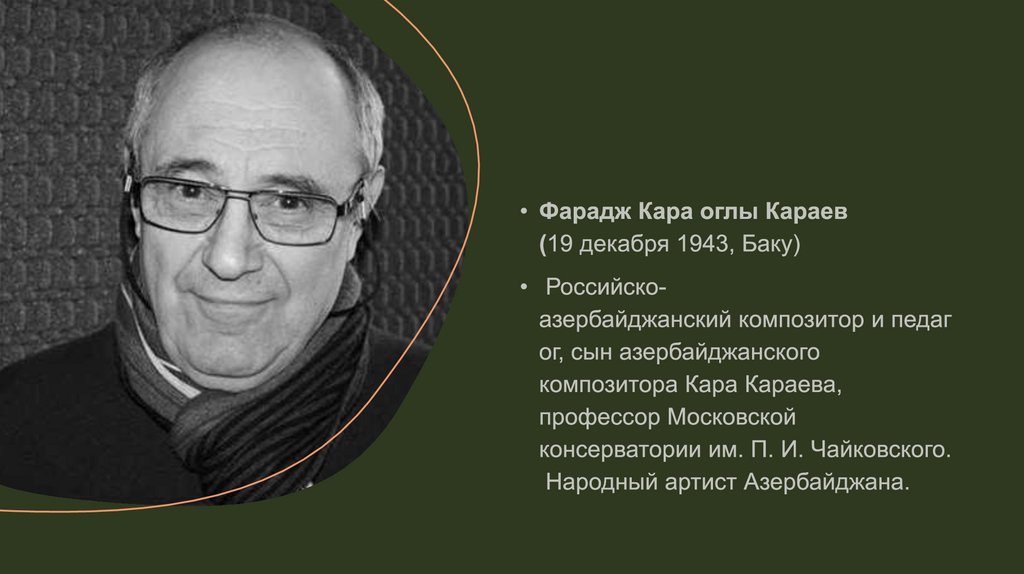• В 1966 году с отличием закончил Азербайджанскую государственнуюконсерваторию по классу композиции у своего отца, профессора Кара