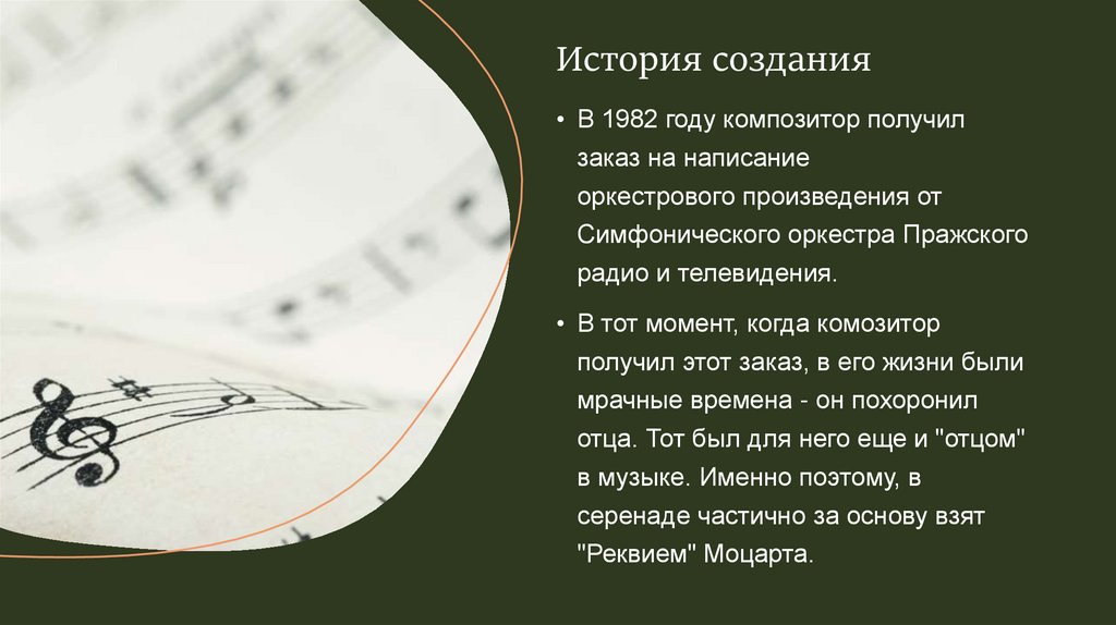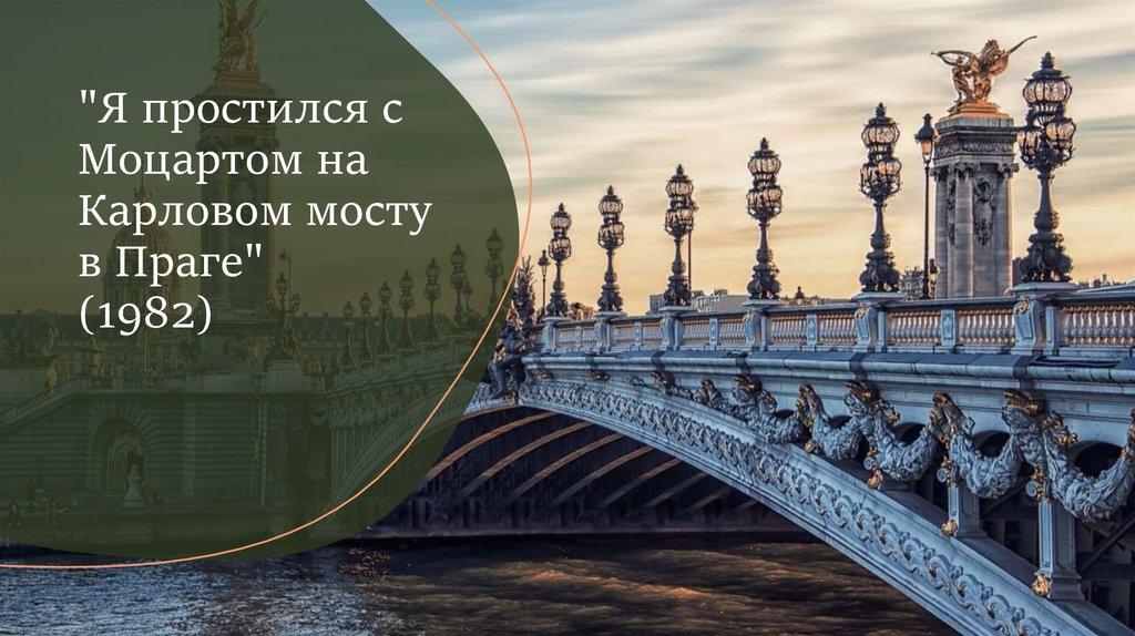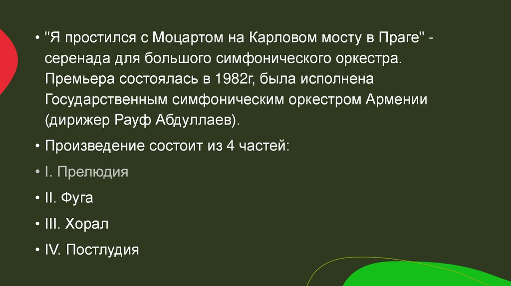 • "Я простился с Моцартом на Карловом мосту в Праге" серенада для большого симфонического оркестра.Премьера состоялась в 1982г, была исполнена