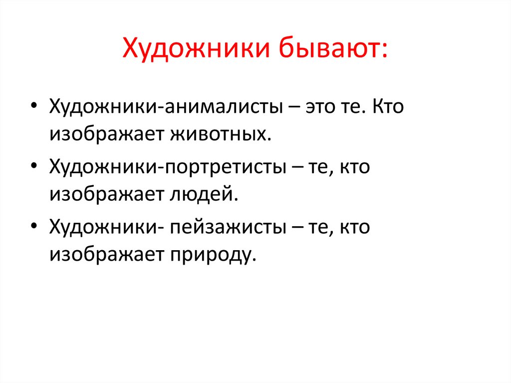 Художники бывают:• Художники-анималисты – это те. Кто