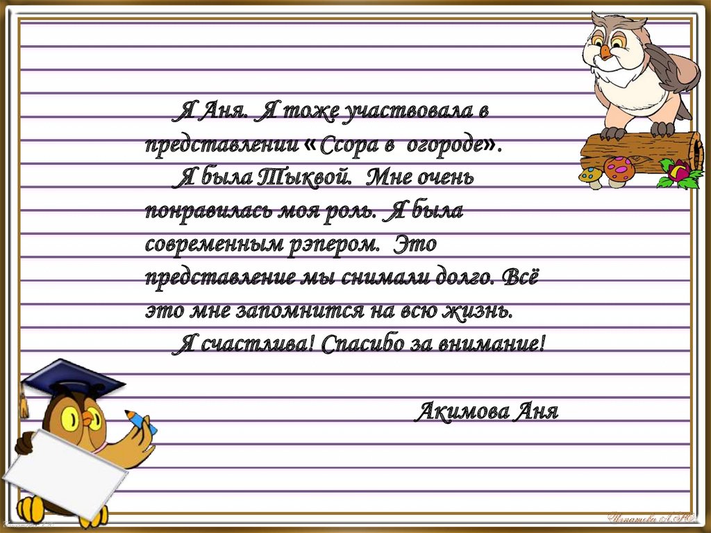 Я Аня. Я тоже участвовала впредставлении «Ссора в огороде».