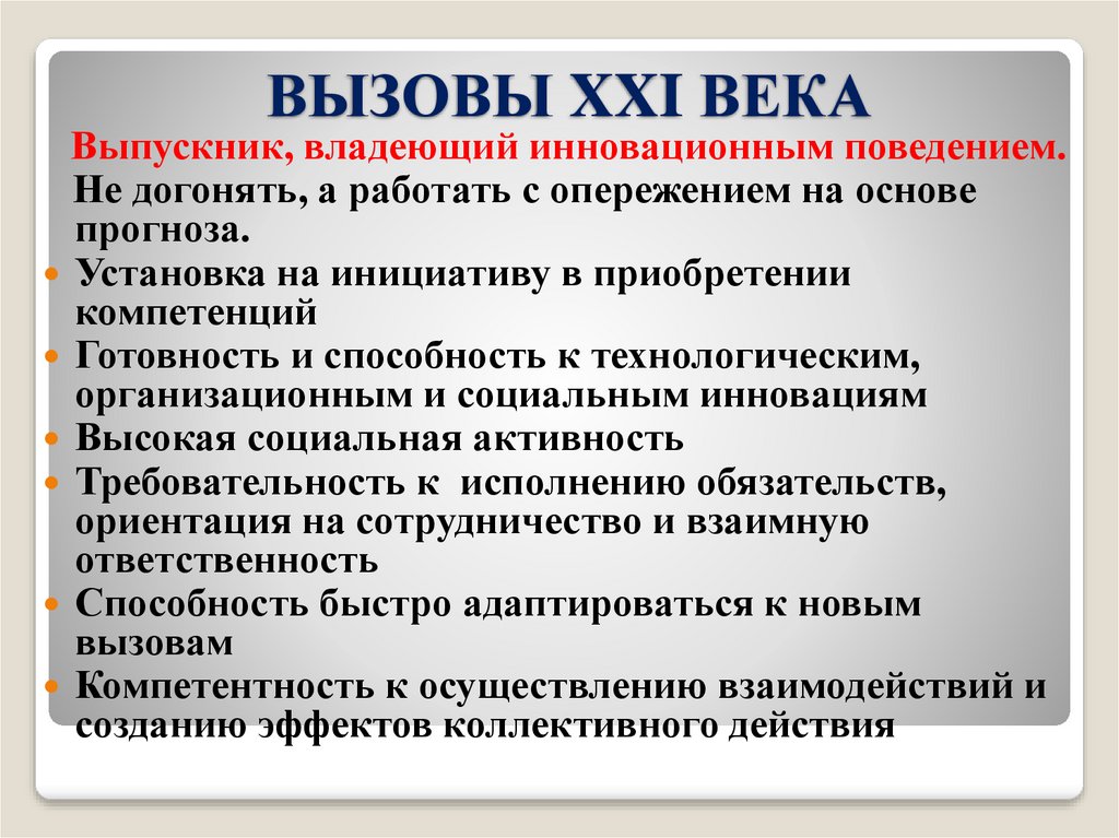 ВЫЗОВЫ XXI ВЕКАВыпускник, владеющий инновационным поведением.