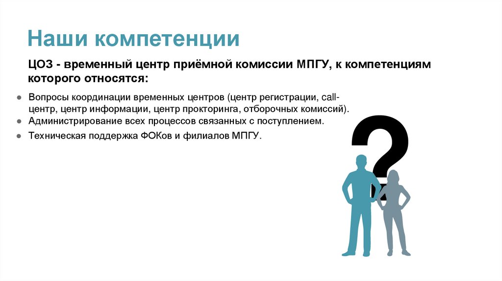 Наши компетенцииЦОЗ - временный центр приёмной комиссии МПГУ, к компетенциям