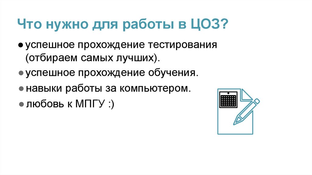 Что нужно для работы в ЦОЗ?● успешное прохождение тестирования