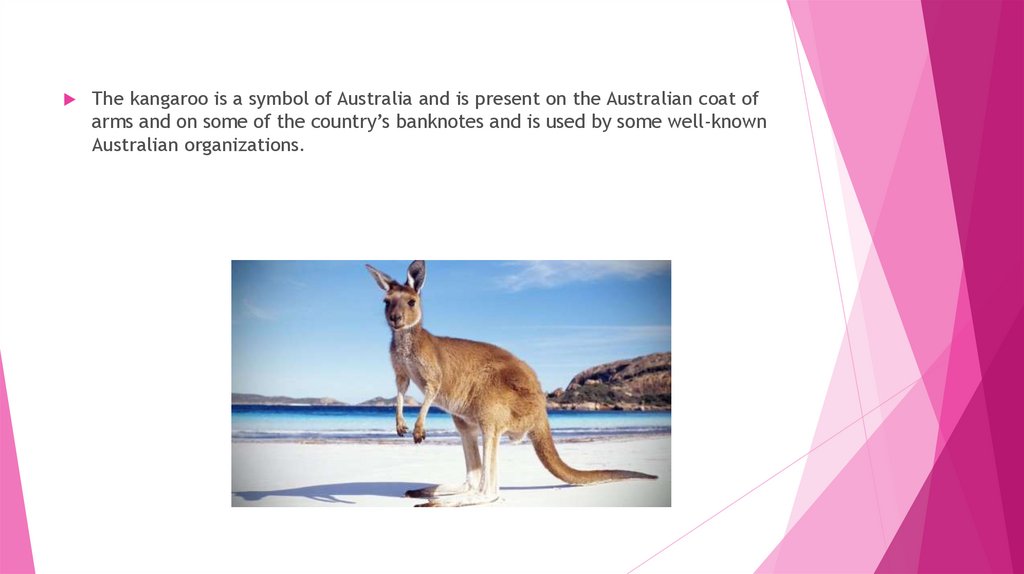 The kangaroo is a symbol of Australia and is present on the Australian coat ofarms and on some of the country’s banknotes and is used by some well-known