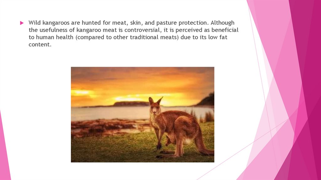 Wild kangaroos are hunted for meat, skin, and pasture protection. Althoughthe usefulness of kangaroo meat is controversial, it is perceived as beneficial