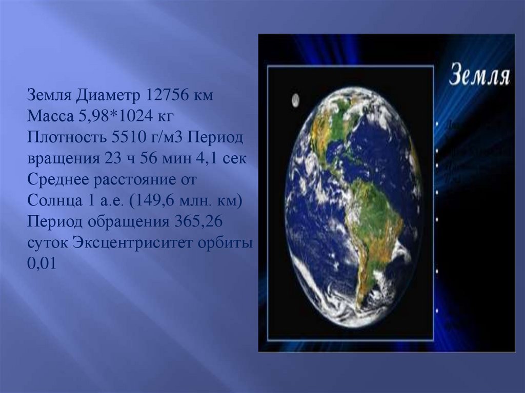 Земля Диаметр 12756 кмМасса 5,98*1024 кг