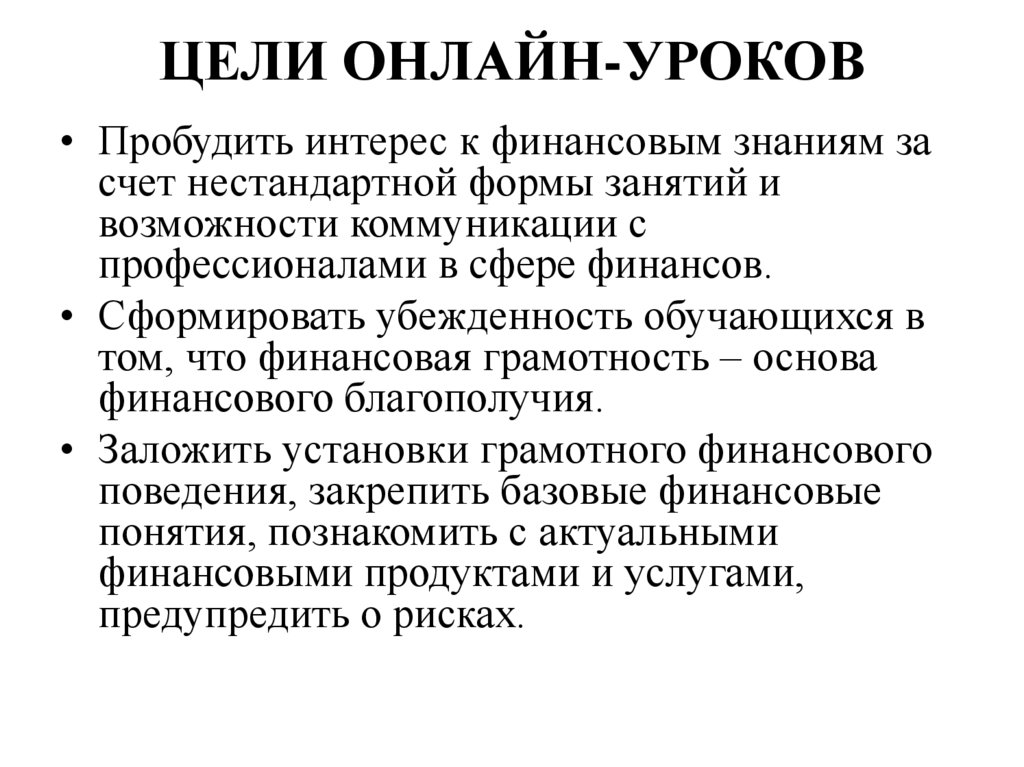 ЦЕЛИ ОНЛАЙН-УРОКОВ• Пробудить интерес к финансовым знаниям за