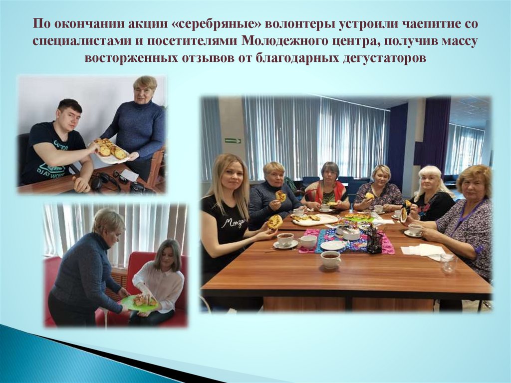 По окончании акции «серебряные» волонтеры устроили чаепитие соспециалистами и посетителями Молодежного центра, получив массу