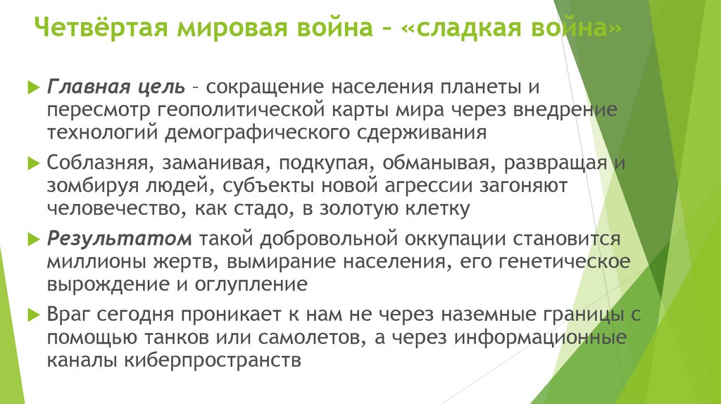 Четвёртая мировая война – «сладкая война»Главная цель – сокращение населения планеты и
