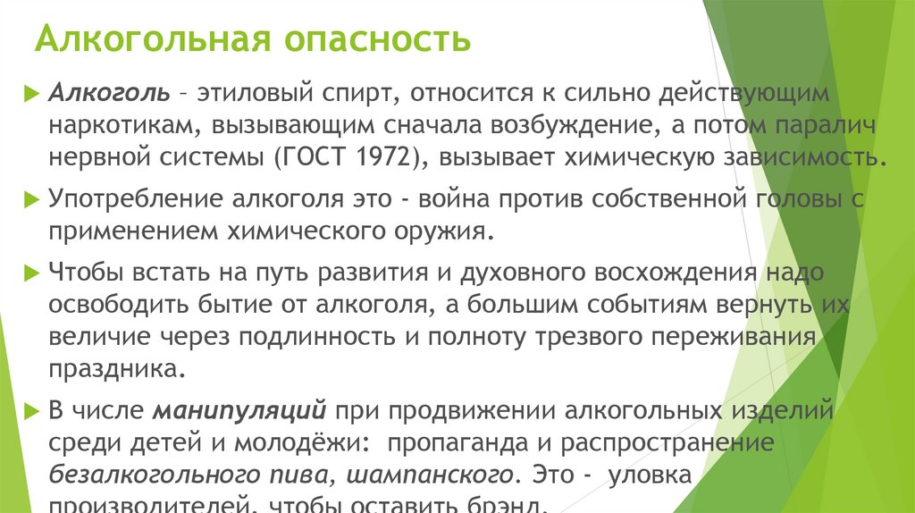 Алкогольная опасностьАлкоголь – этиловый спирт, относится к сильно действующим