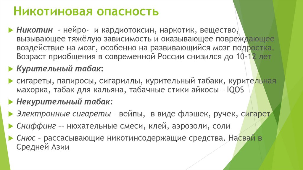 Никотиновая опасностьНикотин – нейро- и кардиотоксин, наркотик, вещество,