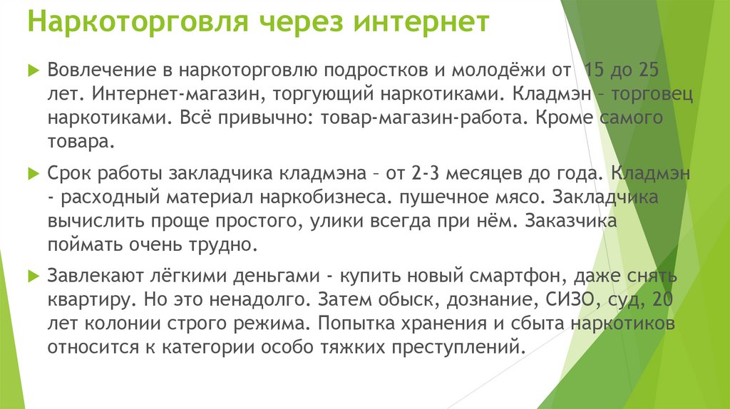 Наркоторговля через интернетВовлечение в наркоторговлю подростков и молодёжи от 15 до 25