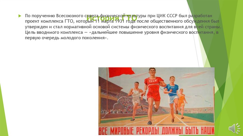 По поручению Всесоюзного совета физической культуры при ЦИК СССР был разработанпроект комплекса ГТО, который 11 марта 1931 года после общественного обсуждения был