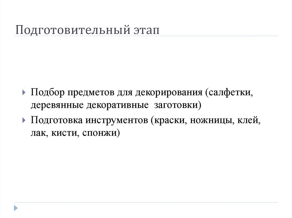 Подготовительный этапПодбор предметов для декорирования (салфетки,