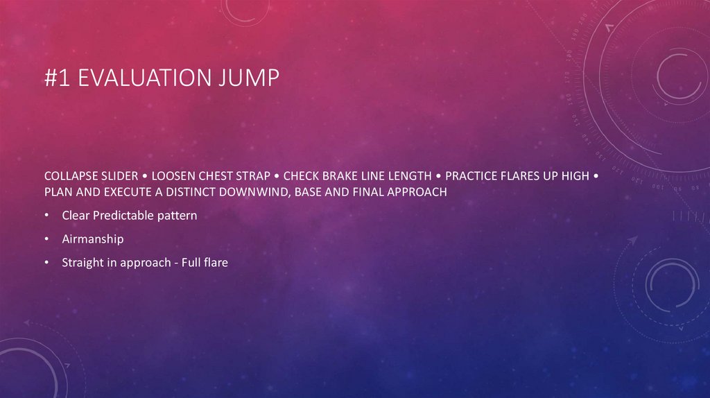 #1 EVALUATION JUMPCOLLAPSE SLIDER • LOOSEN CHEST STRAP • CHECK BRAKE LINE LENGTH • PRACTICE FLARES UP HIGH