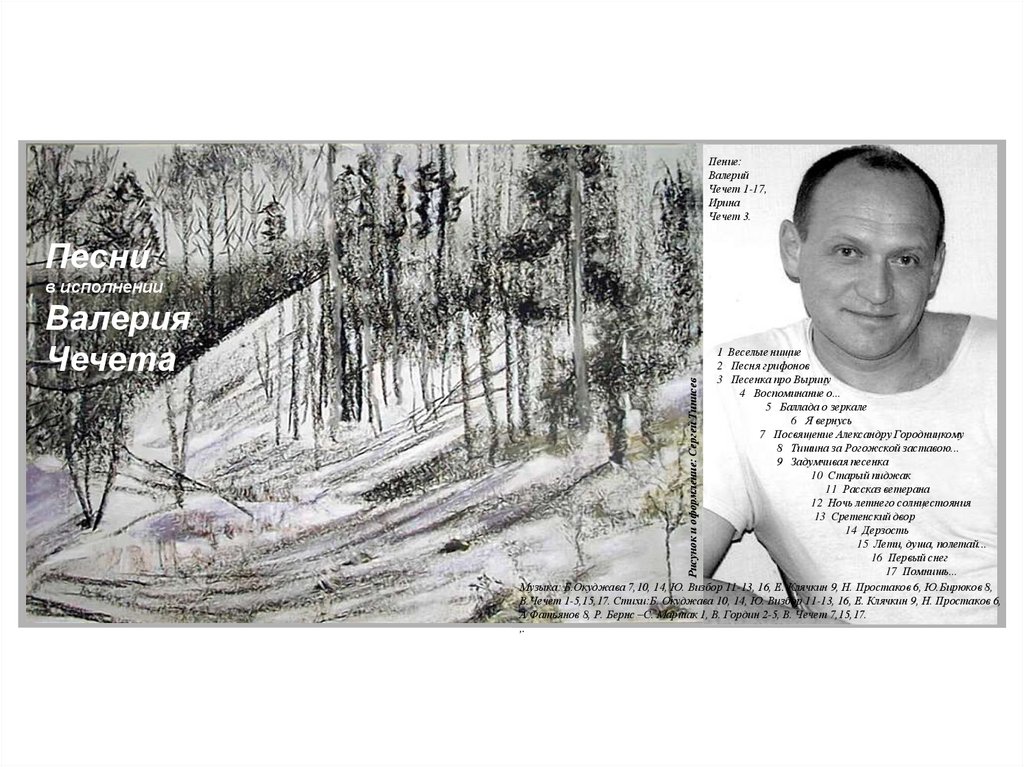 В.Чечет 1-5,15,17. Стихи:Б. Окуджава 10, 14, Ю. Визбор 11-13, 16, Е. Клячкин 9, Н. Простаков 6,
