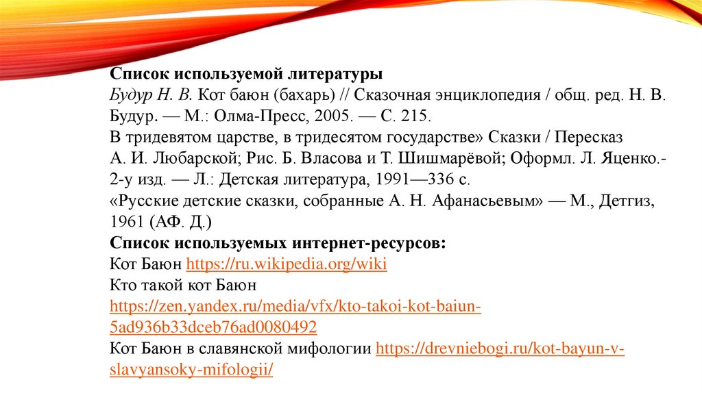 Список используемой литературыБудур Н. В. Кот баюн (бахарь) // Сказочная энциклопедия / общ. ред. Н. В.