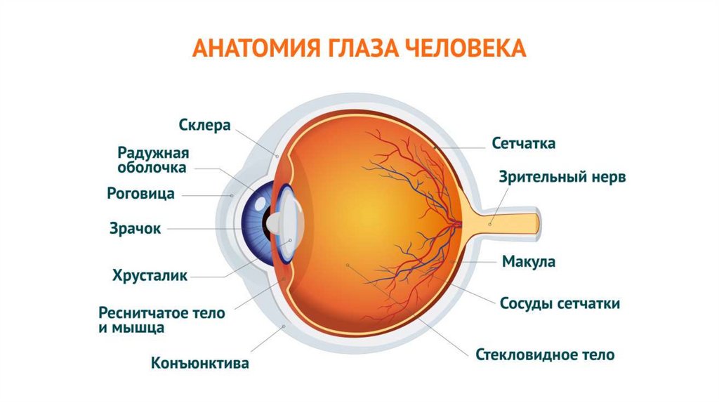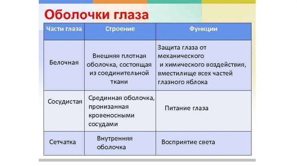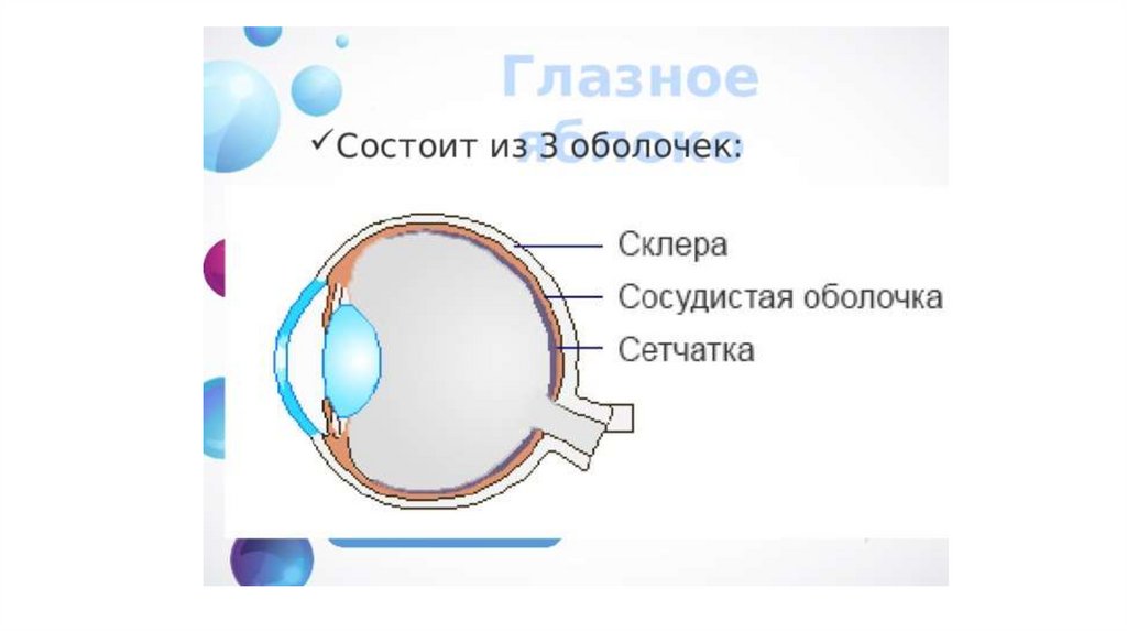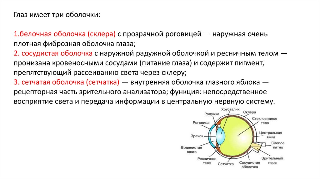 Глаз имеет три оболочки:1.белочная оболочка (склера) с прозрачной роговицей — наружная очень
