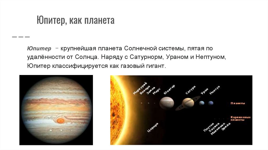 Юпитер, как планетаЮпитер - крупнейшая планета Солнечной системы, пятая по