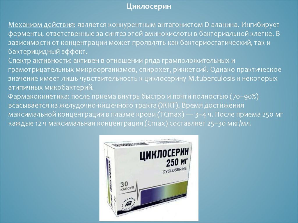 ЦиклосеринМеханизм действия: является конкурентным антагонистом D-аланина. Ингибирует