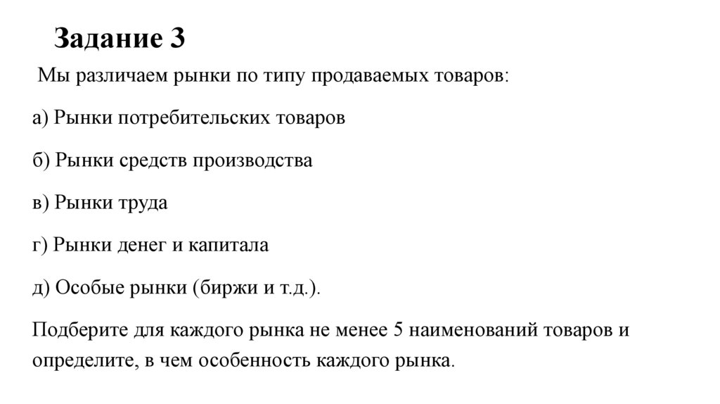 Задание 3Мы различаем рынки по типу продаваемых товаров: