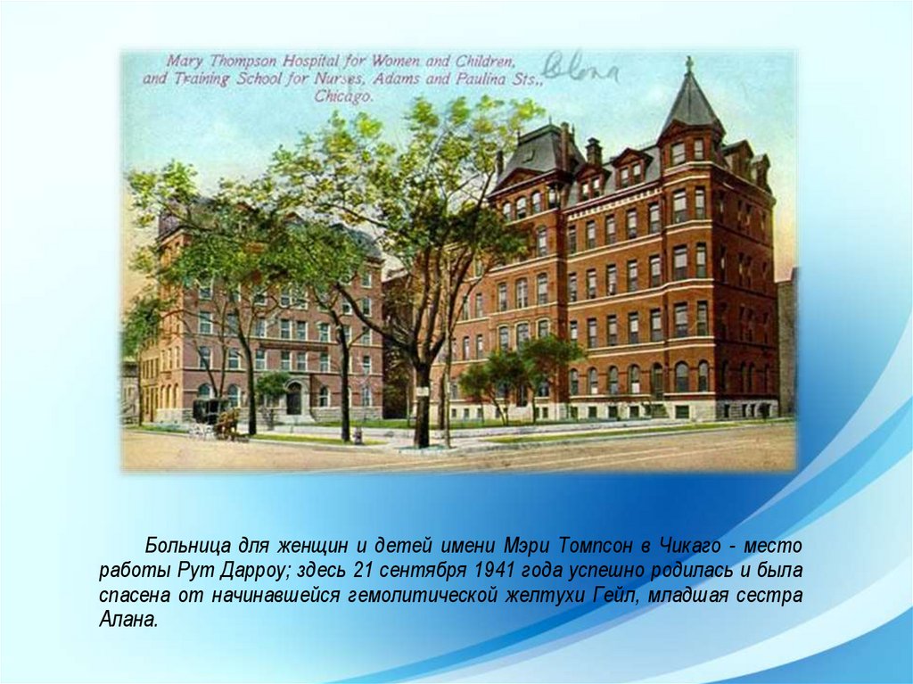 Больница для женщин и детей имени Мэри Томпсон в Чикаго - местоработы Рут Дарроу; здесь 21 сентября 1941 года успешно родилась и была