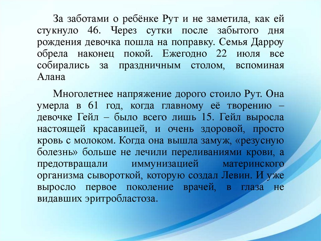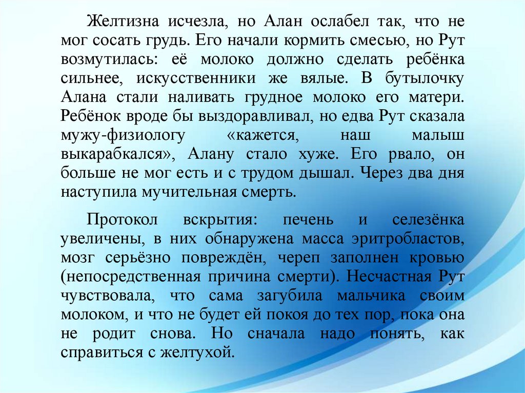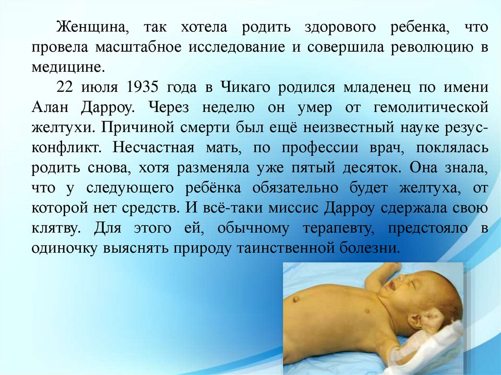 желтухи. Причиной смерти был ещё неизвестный науке резусконфликт. Несчастная мать, по профессии врач, поклялась