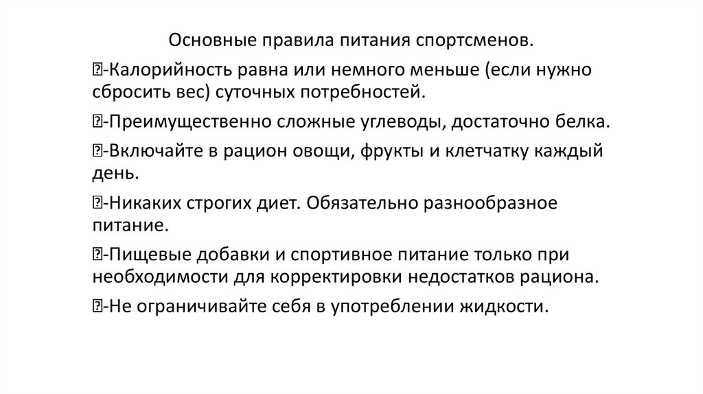Основные правила питания спортсменов.-Калорийность равна или немного меньше (если нужно