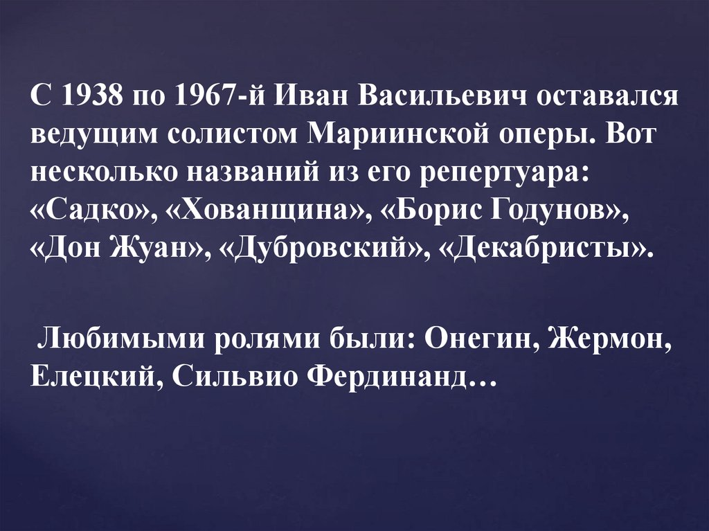 С 1938 по 1967-й Иван Васильевич оставалсяведущим солистом Мариинской оперы. Вот