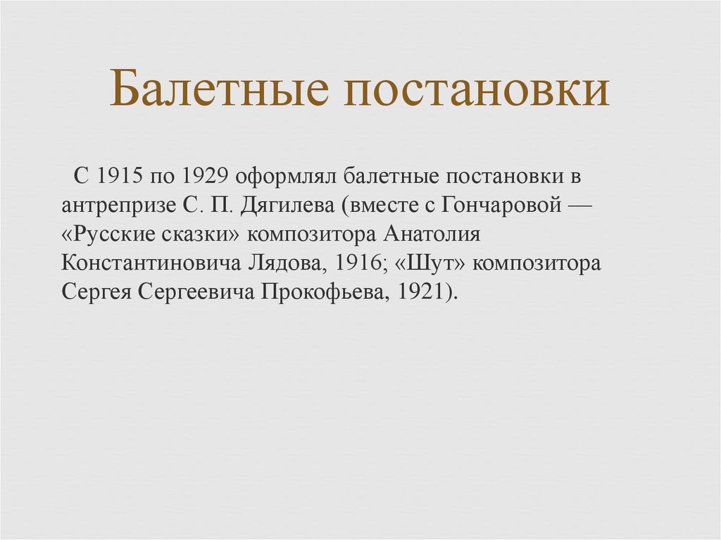 Балетные постановкиС 1915 по 1929 оформлял балетные постановки в