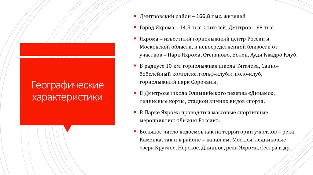 Дмитровский район – 166,8 тыс. жителейГород Яхрома – 14,5 тыс. жителей, Дмитров – 68 тыс.