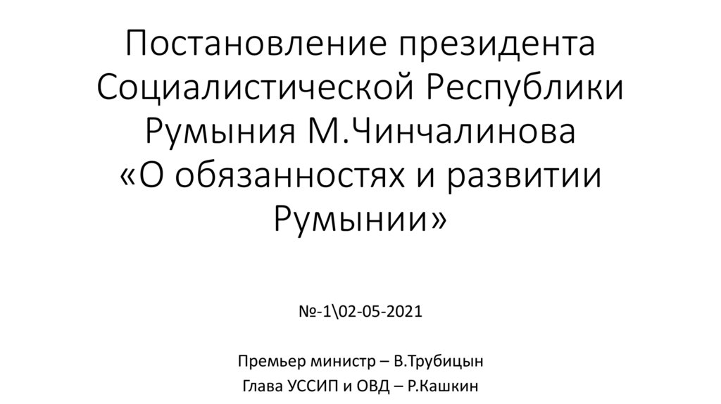 Постановление президента Социалистической Республики Румыния М.Чинчалинова "О обязанностях и развитии Румынии» №-1\02-05-2021"