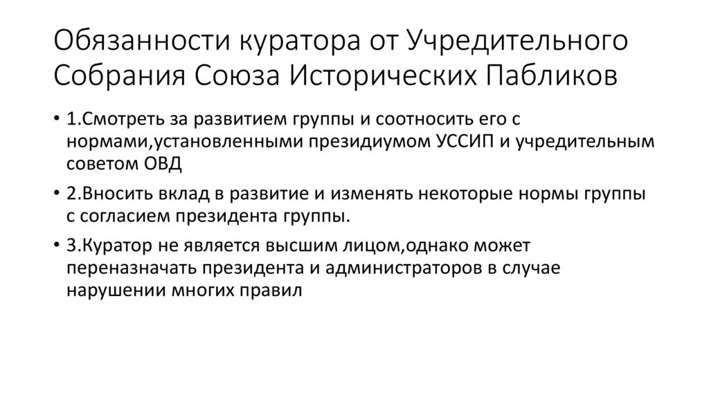 Обязанности куратора от УчредительногоСобрания Союза Исторических Пабликов
