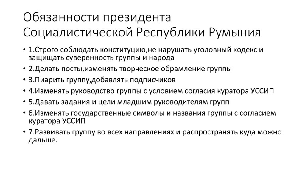 • 1.Участвовать в развитии сообщества,помогать президенту