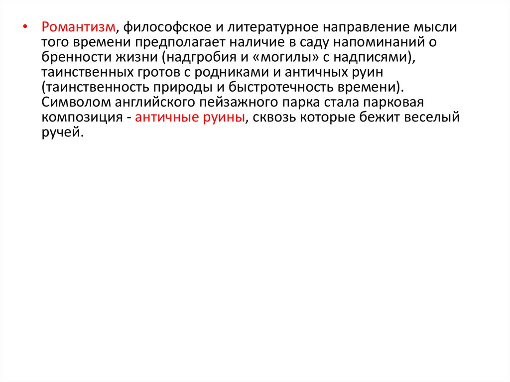 • Романтизм, философское и литературное направление мыслитого времени предполагает наличие в саду напоминаний о