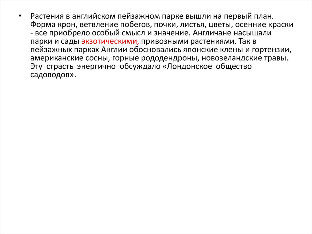 • Растения в английском пейзажном парке вышли на первый план.Форма крон, ветвление побегов, почки, листья, цветы, осенние краски