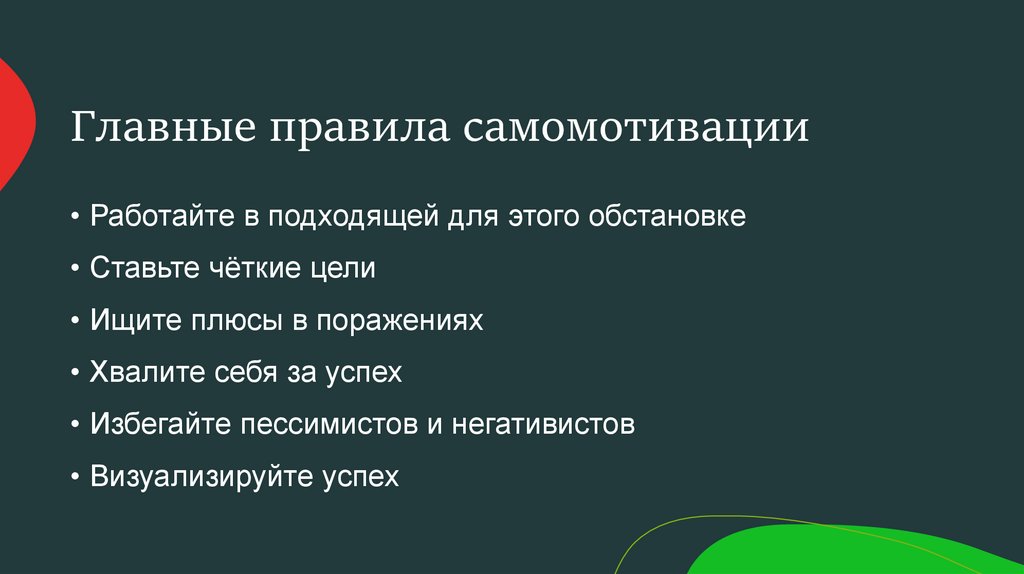 Главные правила самомотивации• Работайте в подходящей для этого обстановке