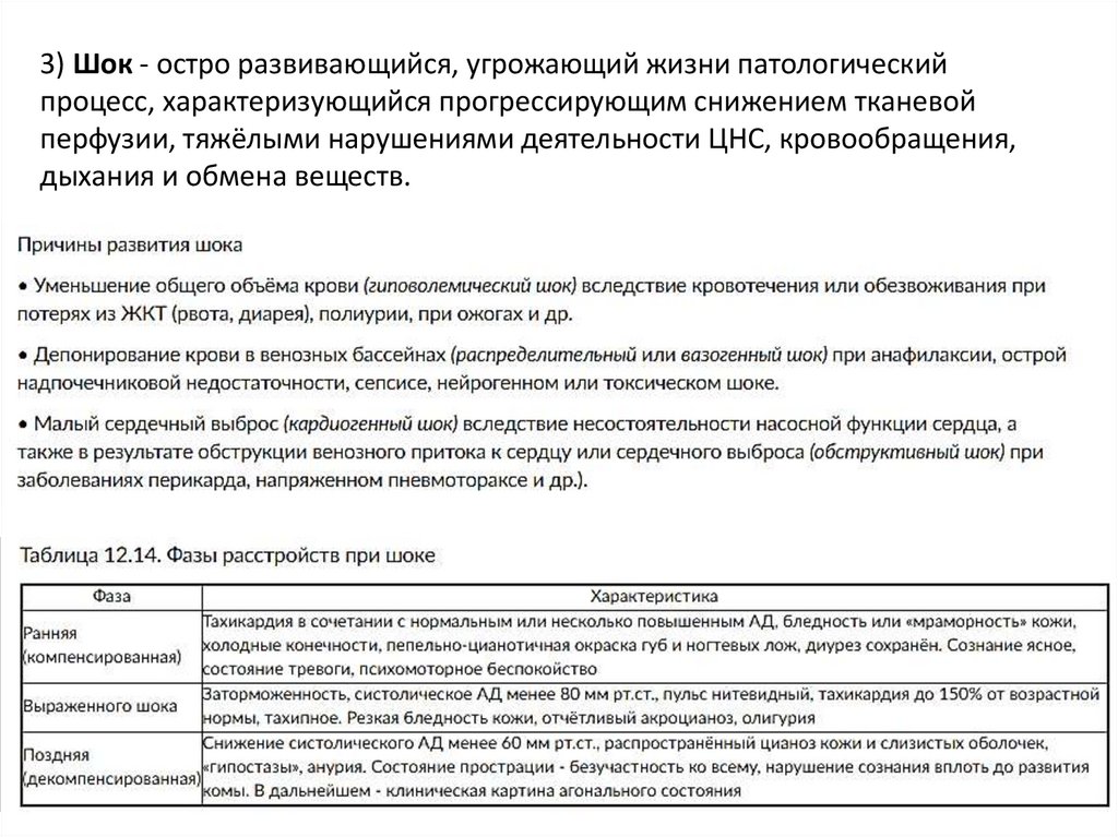 3) Шок - остро развивающийся, угрожающий жизни патологическийпроцесс, характеризующийся прогрессирующим снижением тканевой